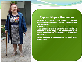 Гурова Мария Павловна, 06.04.1939 года рождения, бывший несовершеннолетний узник фашистских концлагерей.