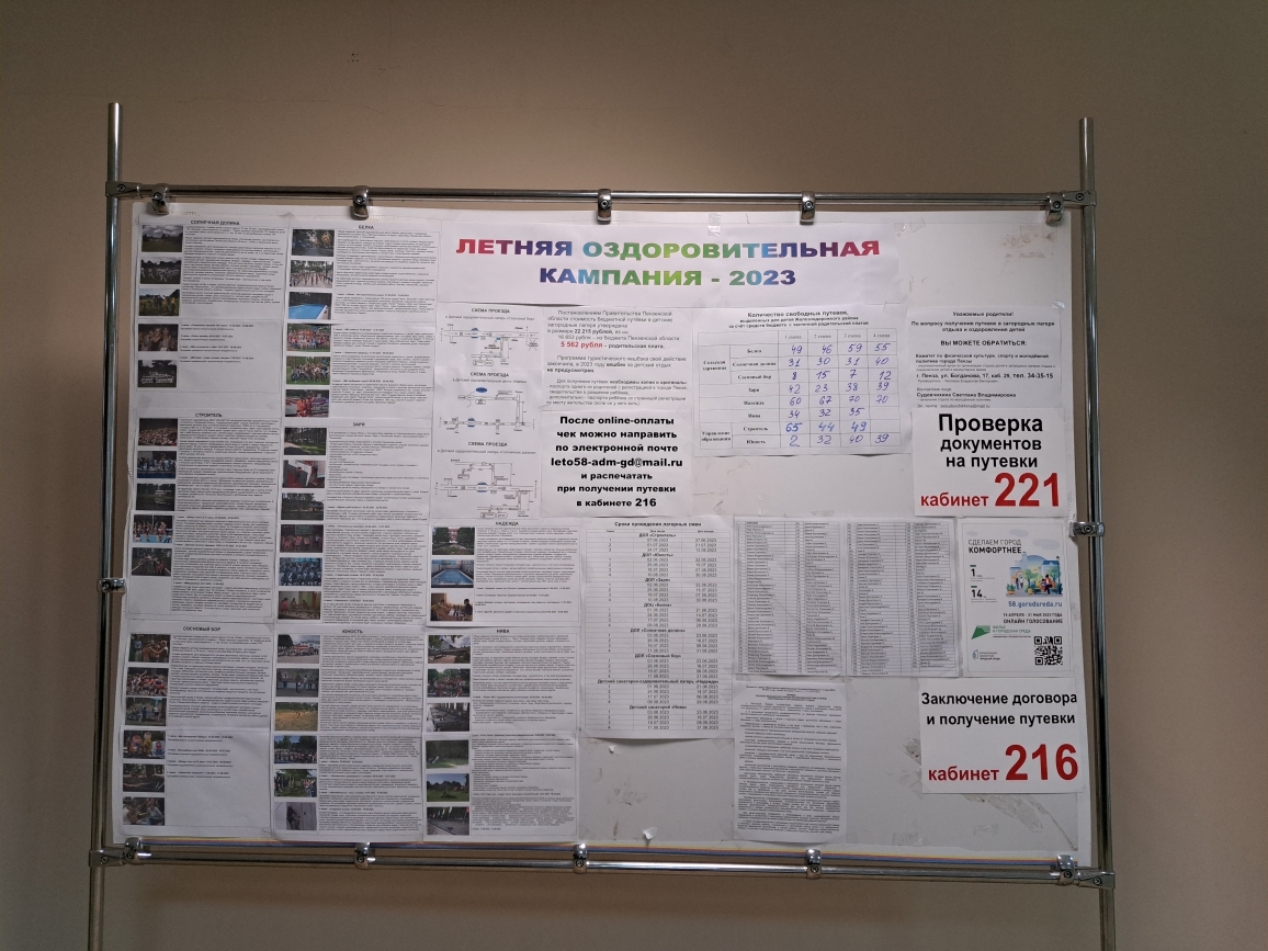 Вся информация о лагерях, сроках заезда, количестве и длительности смен в каждом лагере размещена на информационном стенде в администрации Железнодорожного района (ул.Московская,110, 2 этаж) или на сайте Leto58.ru.