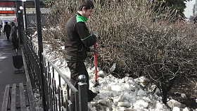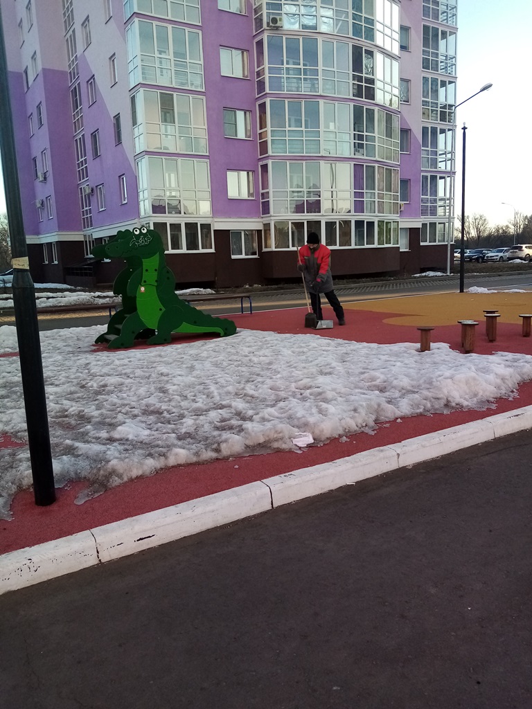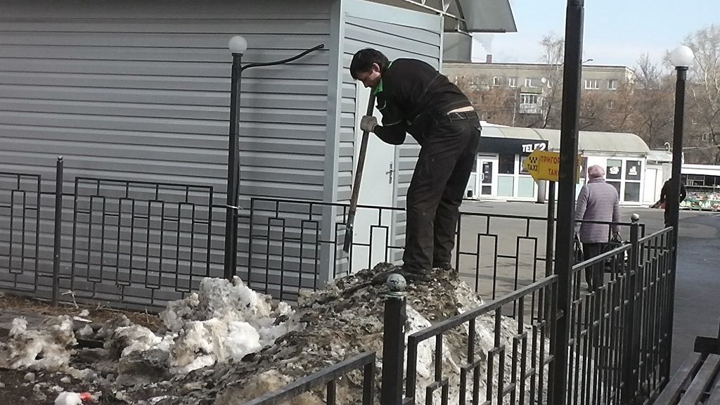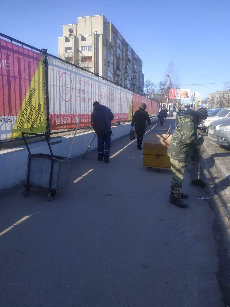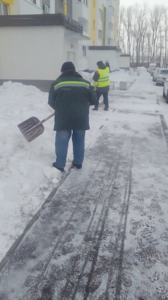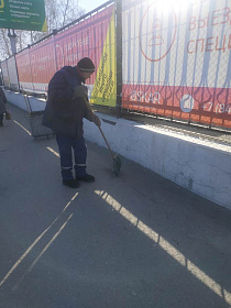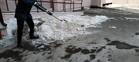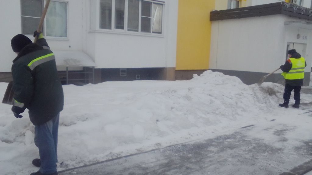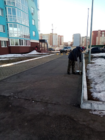 Работники управляющих компаний, ТСЖ, ЖСК трудились на придомовых территориях многоквартирных домов, выполнено ворошение снега, уборка мусора, подметание входных групп МКД.