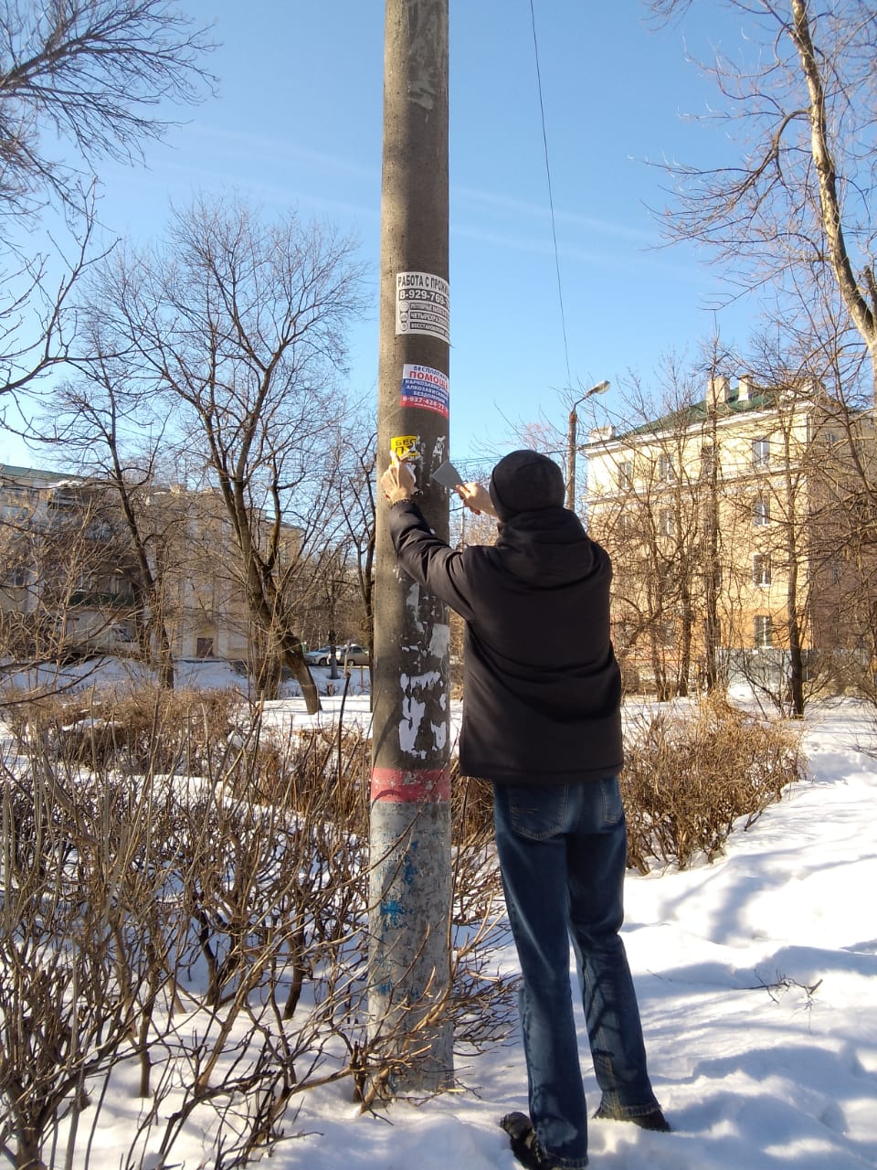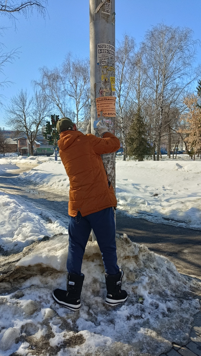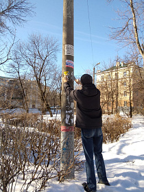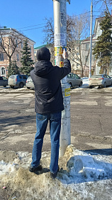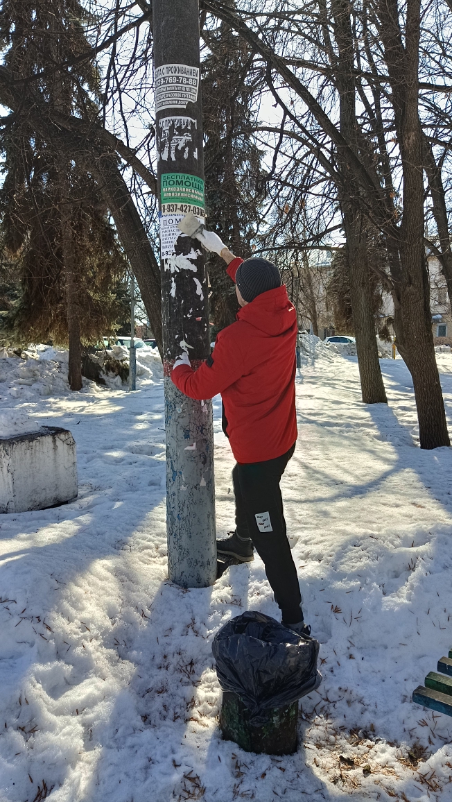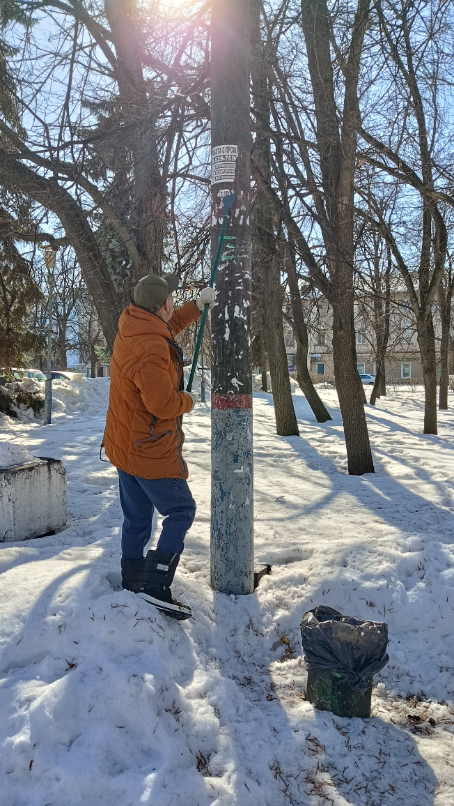 По улицам Луначарского, Дзержинского, Ухтомского, Чехова, Октябрьская продолжена работа по очистке опор наружного освещения от незаконно расклеенных объявлений.