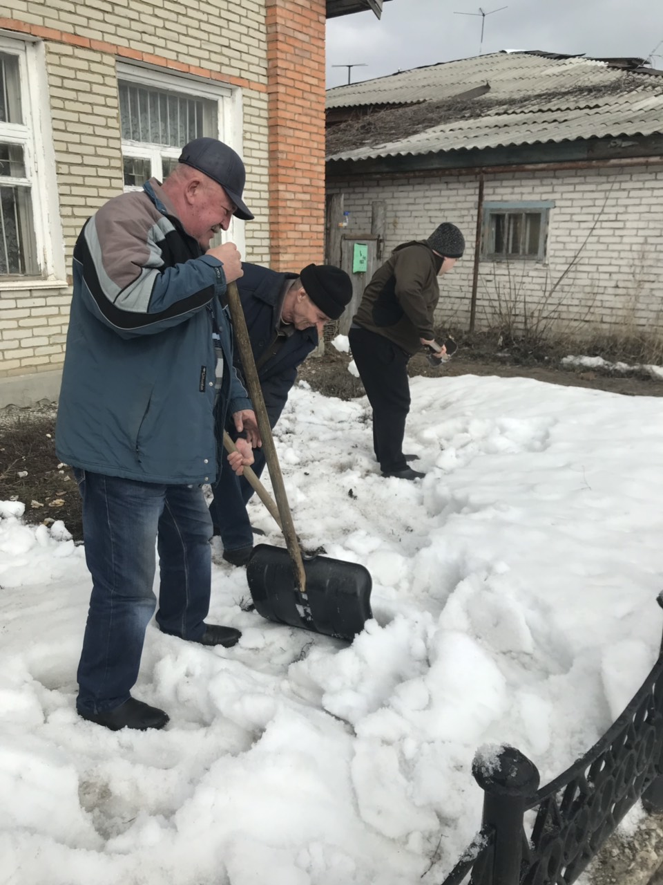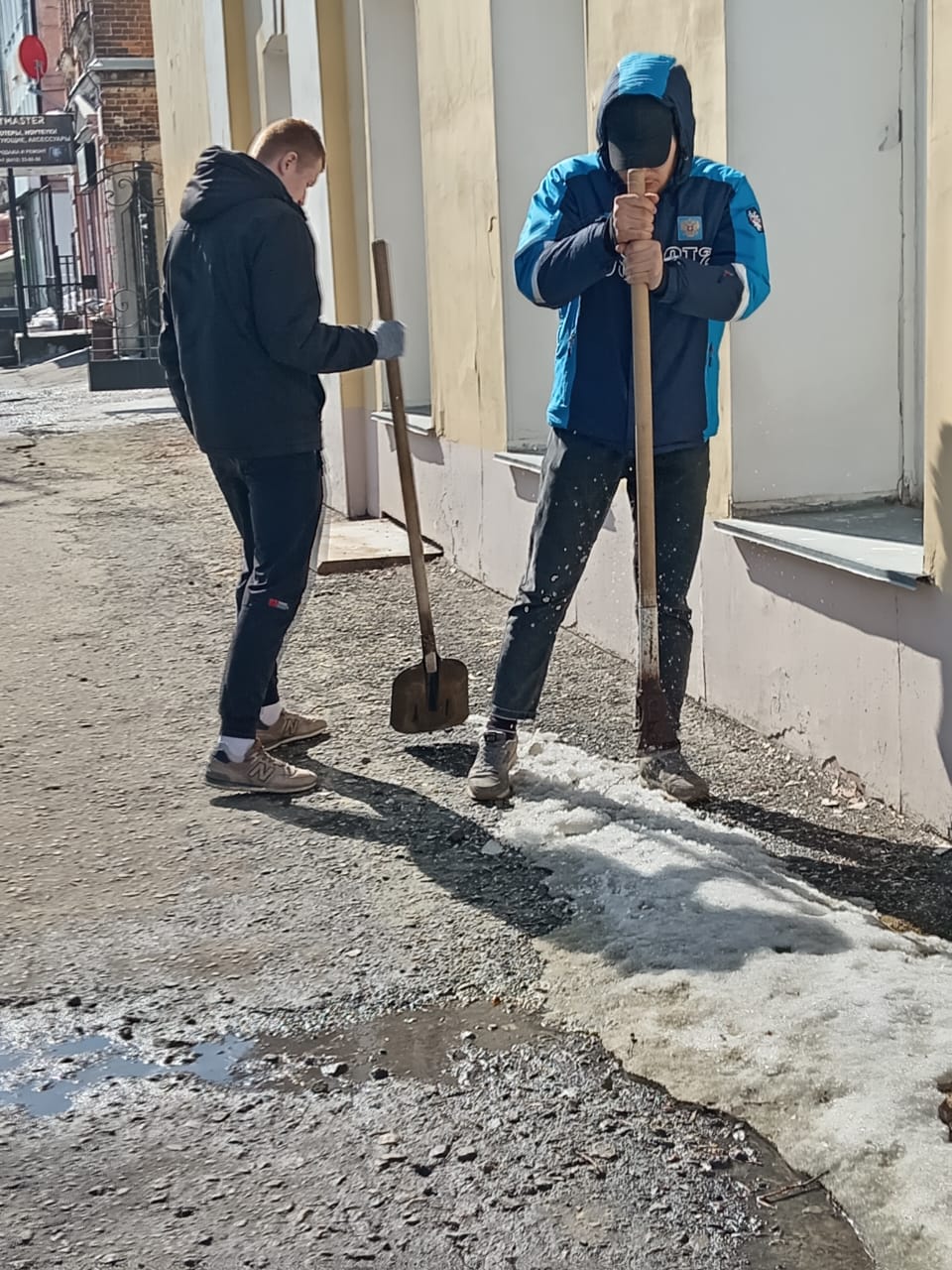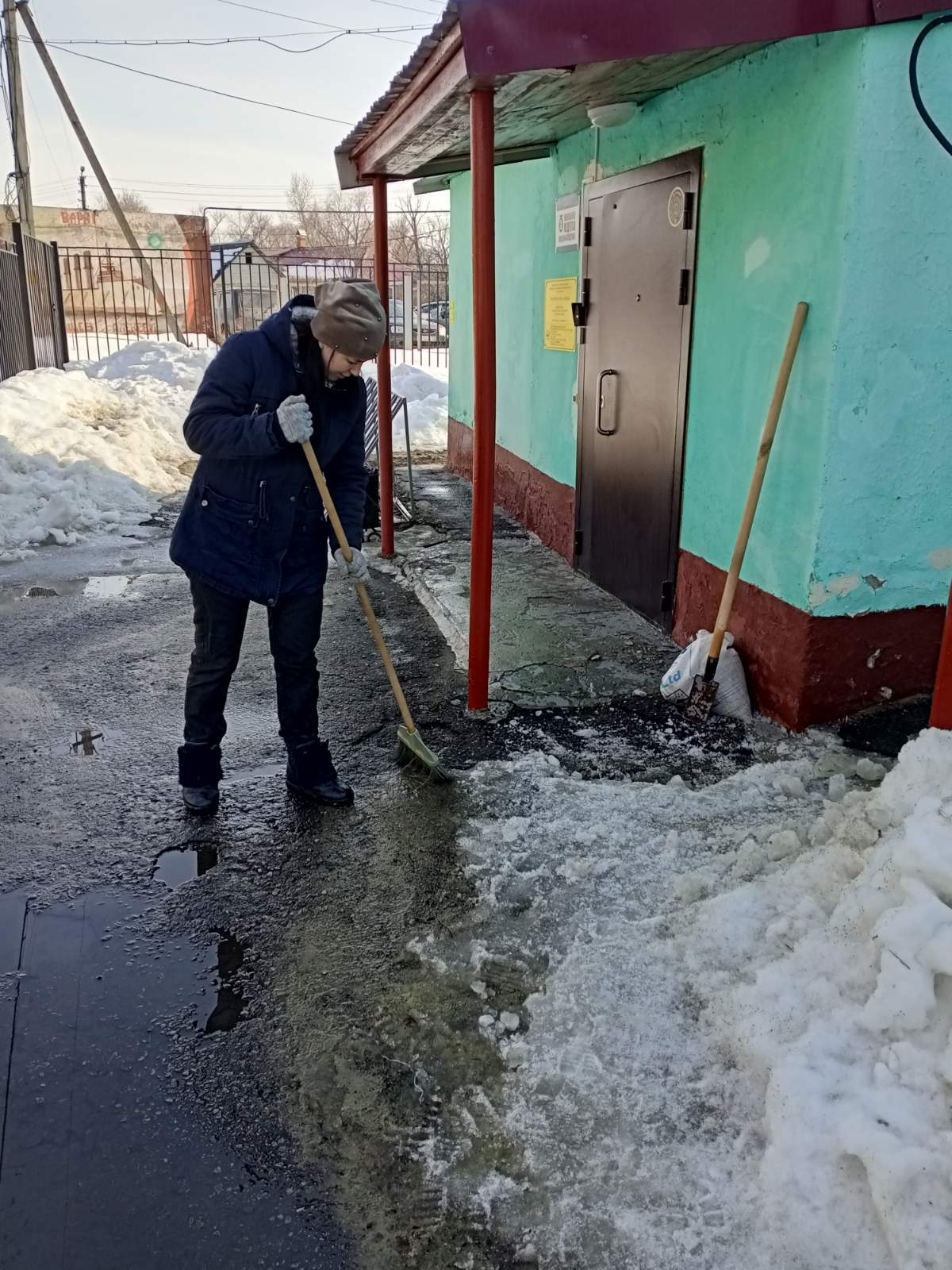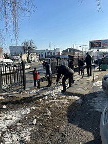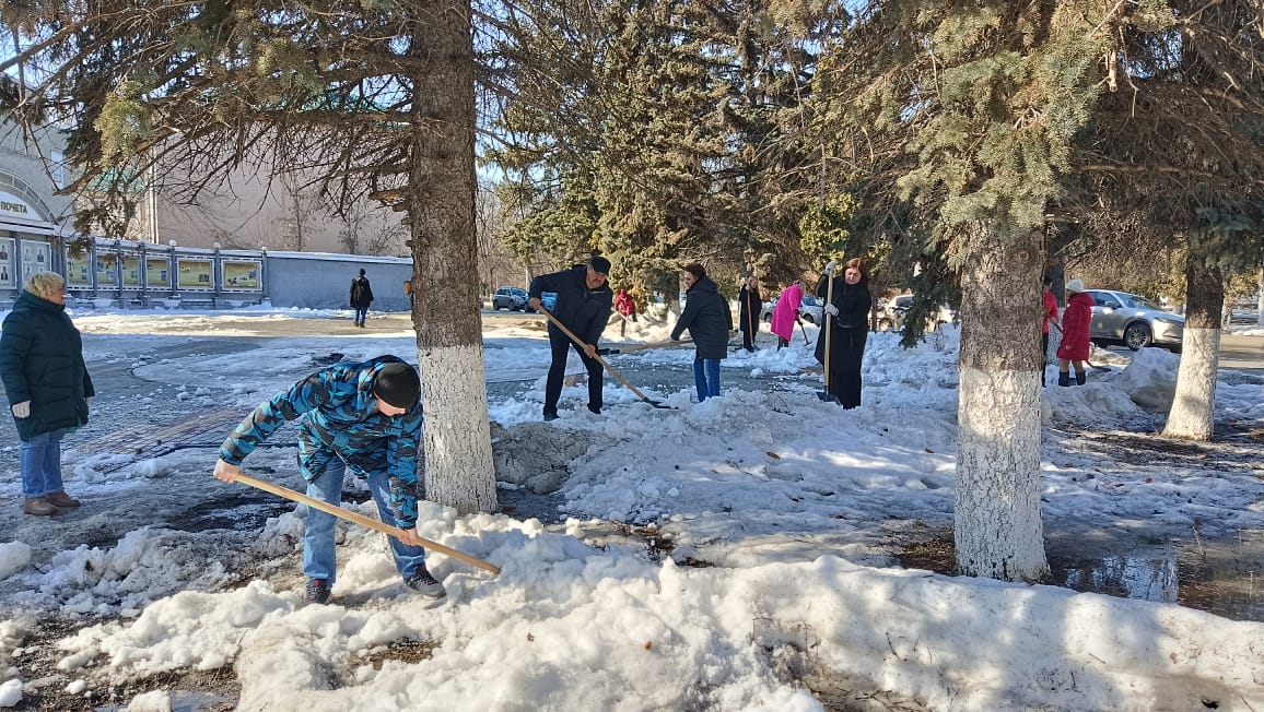 Сотрудники администрации района тоже приняли участие в санитарной пятнице, ворошили снег на улице Московская.
