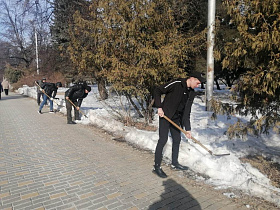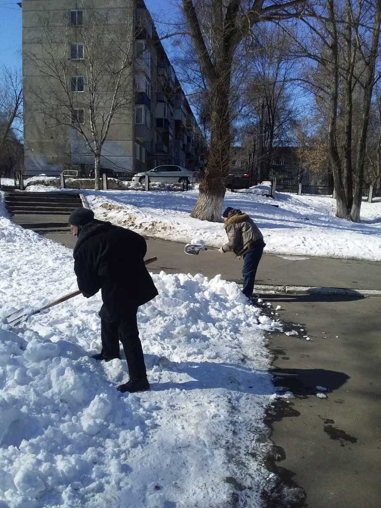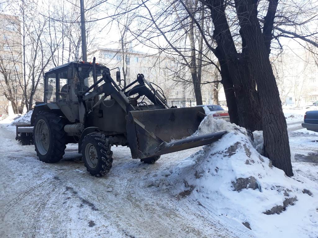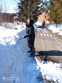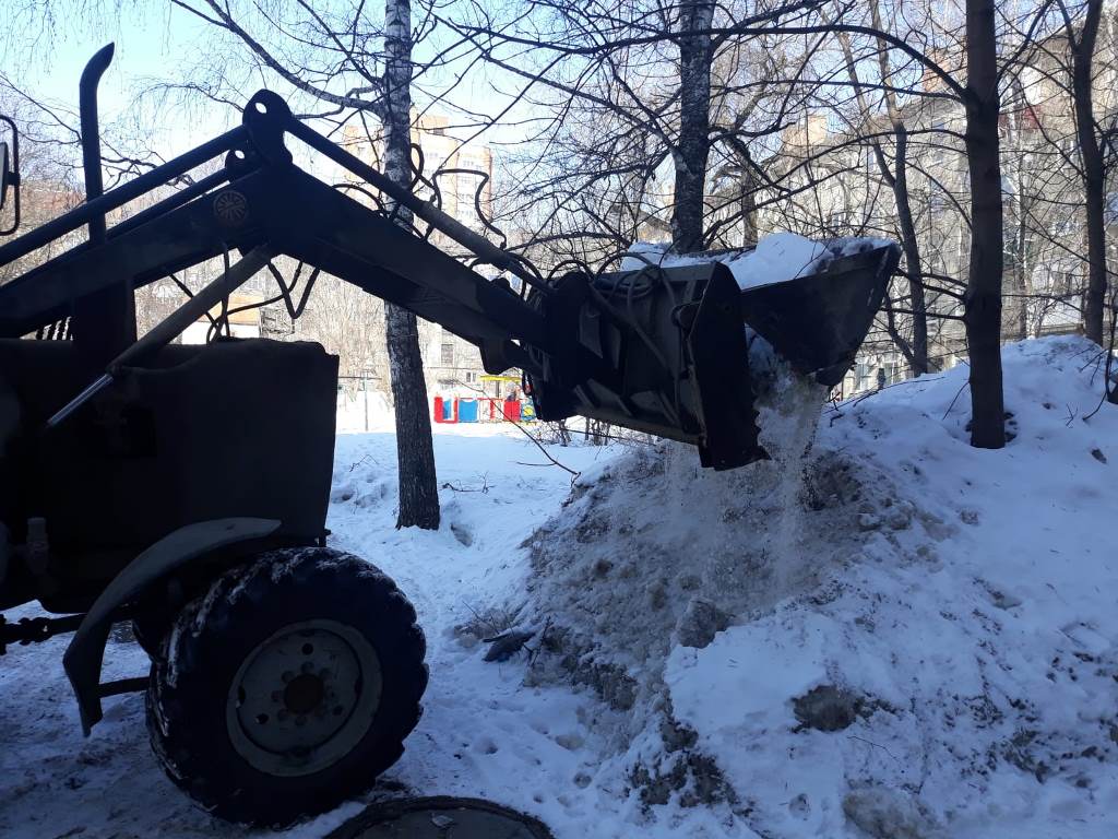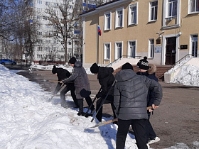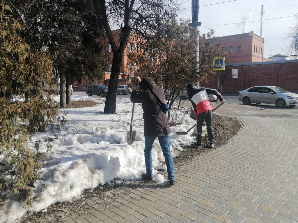 Сотрудники администрации города Пензы и Железнодорожного района, МКУ «Управление по делам ГОЧС г. Пензы», Управления образования города Пензы, Управления транспорта и связи города Пензы, МКУ «Центр закупок г. Пензы» ворошили снежные валы по ул. Суворова.