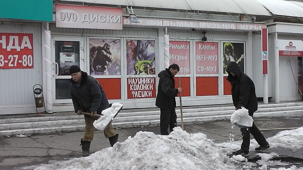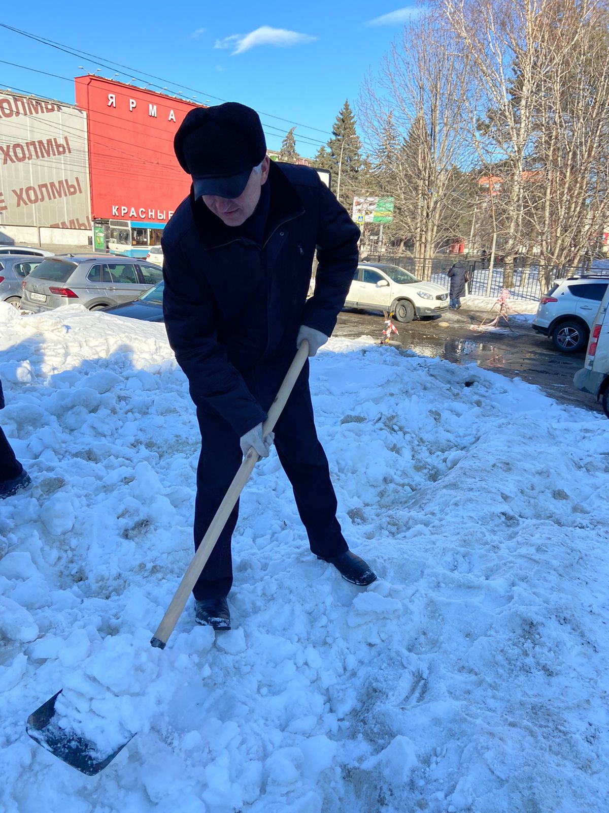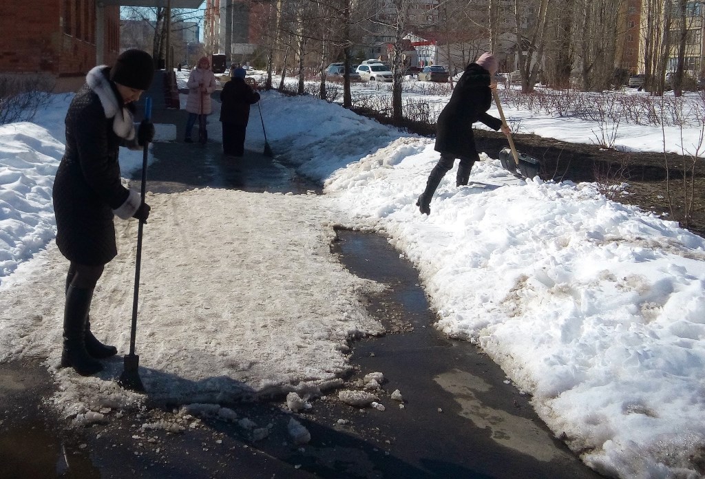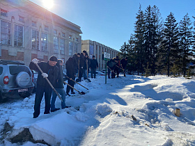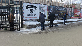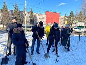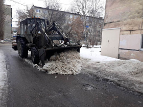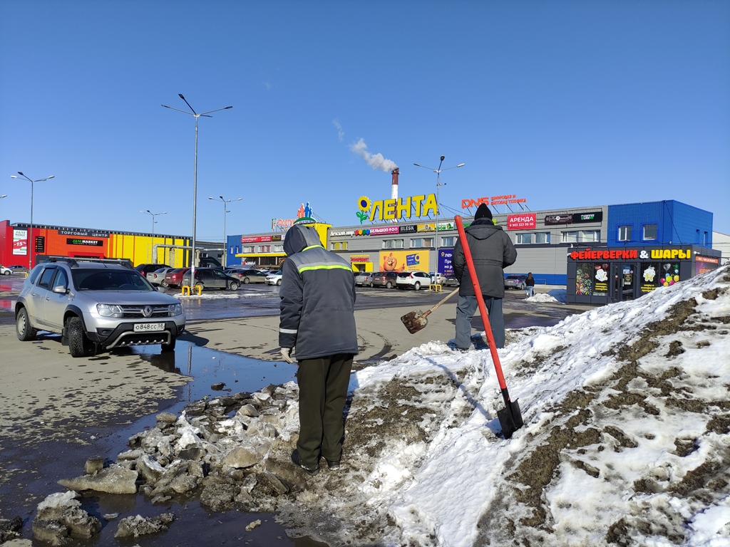 Сотрудники администрации города Пензы и Железнодорожного района, МКУ «Управление по делам ГОЧС г. Пензы», Управления образования города Пензы, Управления транспорта и связи города Пензы, МКУ «Центр закупок г. Пензы» ворошили снежные валы по ул. Суворова.