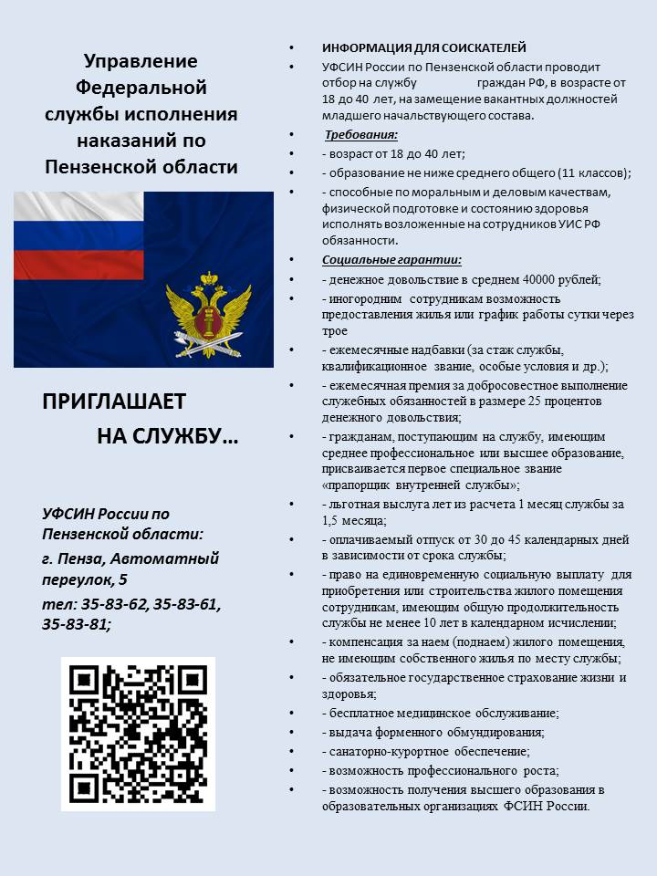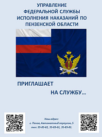 •УФСИН России по Пензенской области проводит отбор на службу граждан РФ, в возрасте от 18 до 40 лет, на замещение вакантных должностей младшего начальствующего состава.