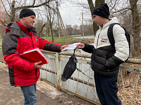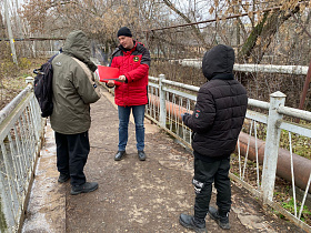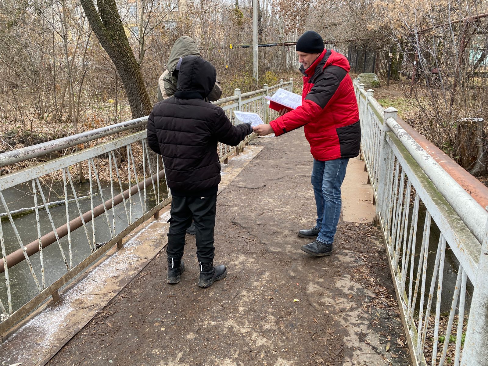 Согласно требований Постановления администрации города Пензы № 1798 от 16.11.2022 «О мерах по обеспечению безопасности населения на водных объектах города Пензы в осенне-зимне-весенний период 2022-2023 годов» на территории Железнодорожного района г. Пензы проведен межведомственный профилактический рейд по безопасному нахождению граждан на водоемах, расположенных рядом с пляжем в районе ГПЗ (напротив МКД «Сурская ривьера»); в местах возможного выхода людей на лед около частных домов ул. Чапаева, д. 5, 59; ул. Чаадаева, 2; в районе МБОУ СОШ № 43 по ул. Парковая, 2.