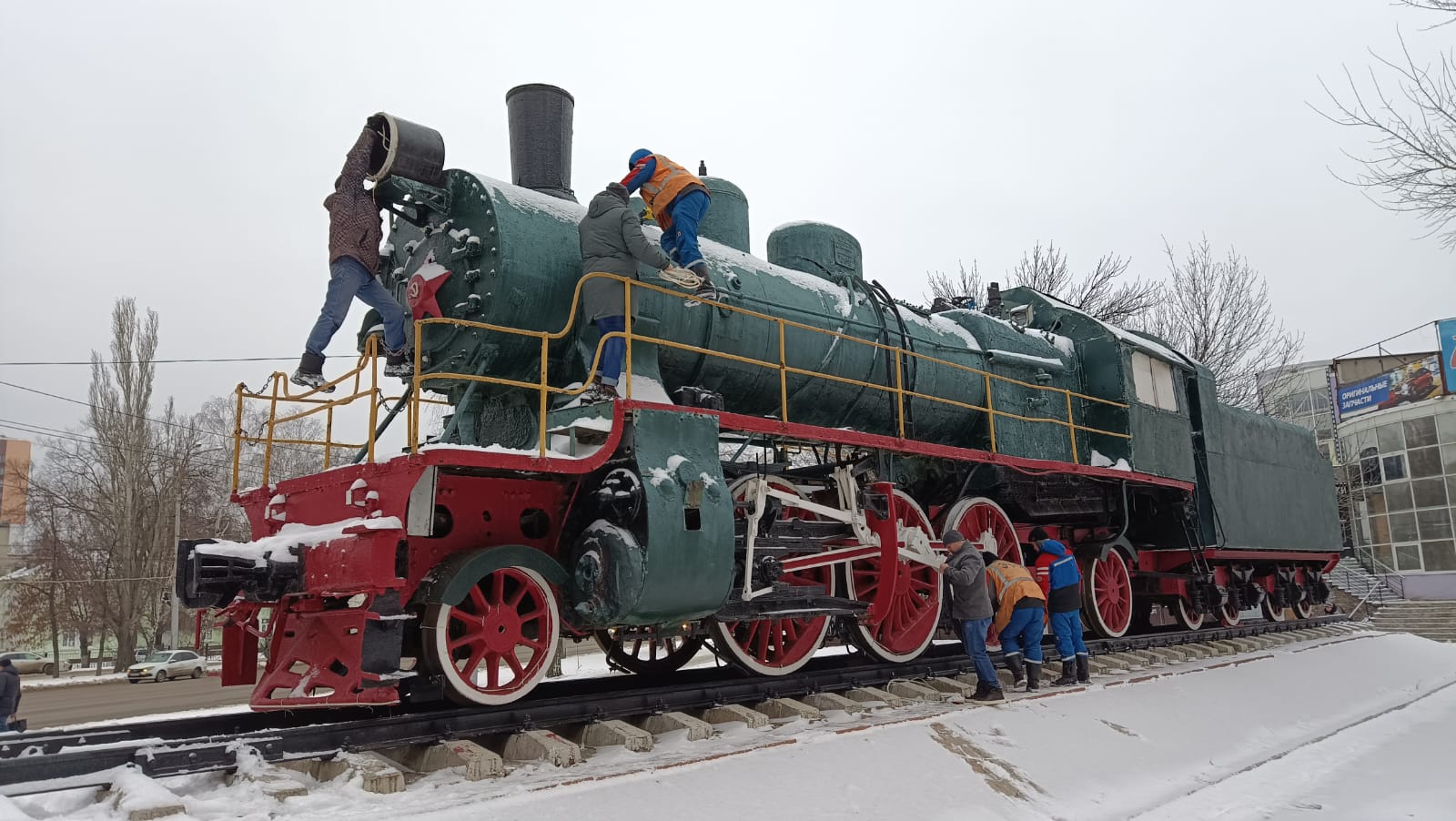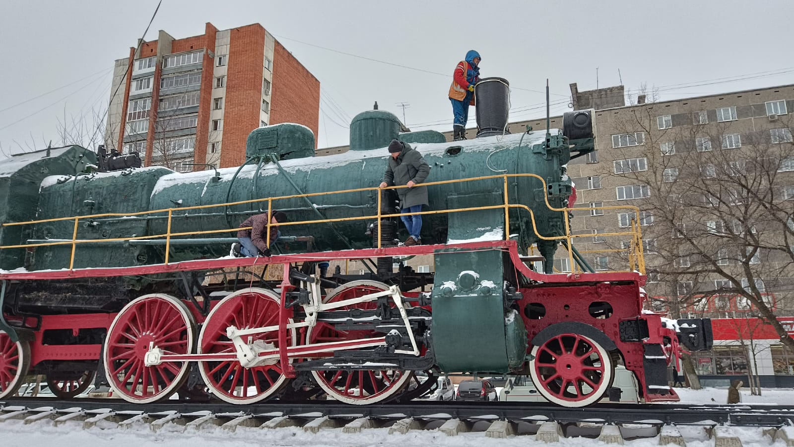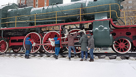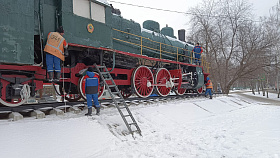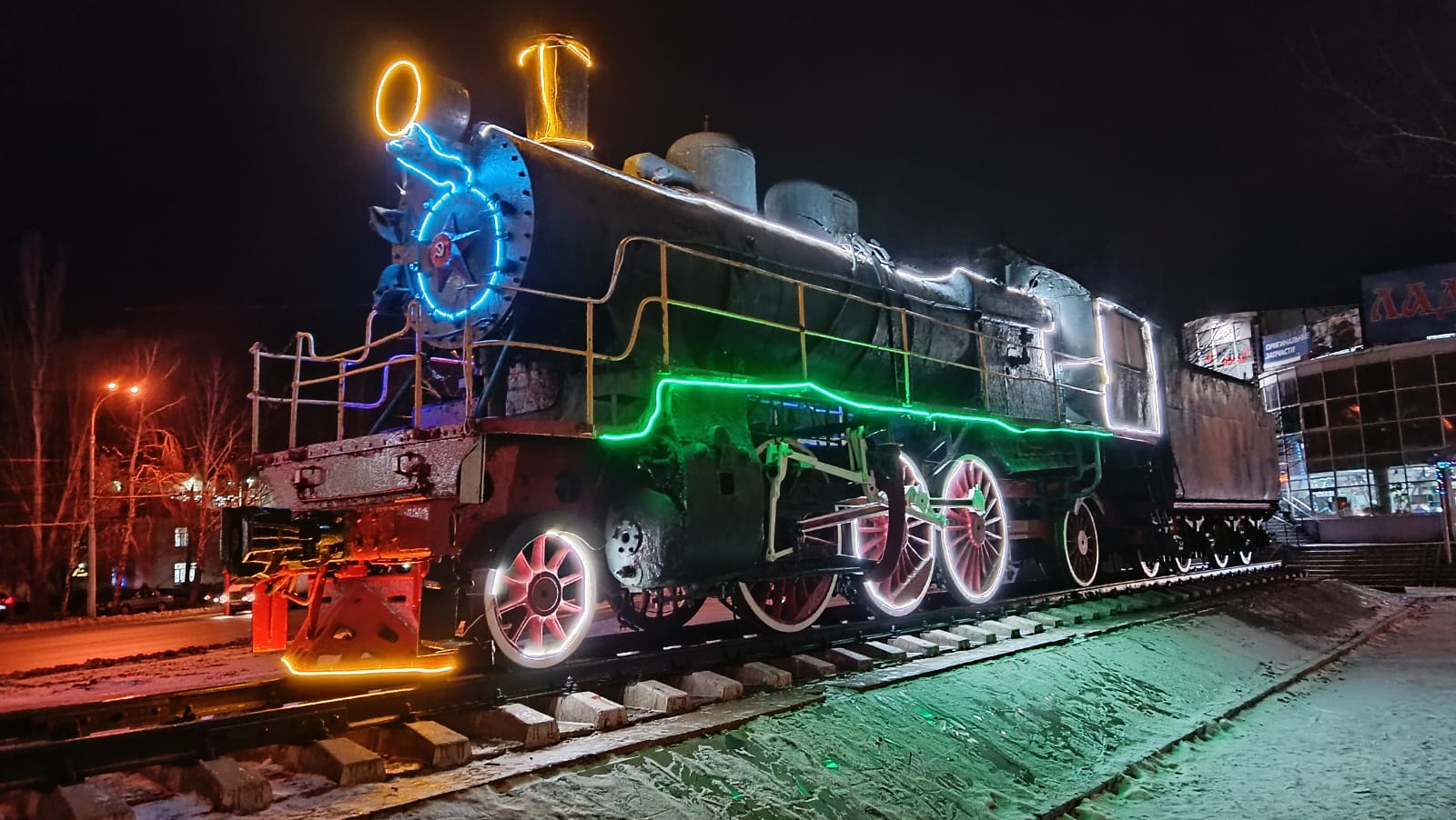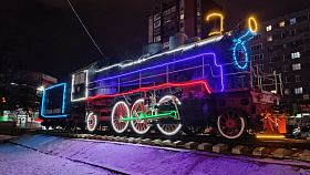 Завораживает, сияет разноцветными огнями символ Железнодорожного района - монумент «Паровоз Су213-89» . На время новогодних праздников он превратился в сказочного персонажа, забавного героя мультфильмов.