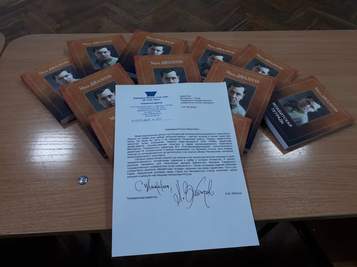 В завершение мероприятия с целью воспитания молодежи в духе патриотизма, любви к Родине все присутствующие получили подарок – сборник стихов Мусы Джалиля «Моабитская тетрадь», изданное при содействии студента колледжа (в прошлом - Пензенского техникума железнодорожного транспорта) генерального директора АО «Уголь-Транс» Хасяна Зябирова.