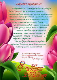 Поздравляем вас с Международным женским днём 8 Марта! Этот весенний праздник наполнен добром и любовью, теплом и нежностью, надеждой и верой, красотой и гармонией. Именно с прекрасной половиной человечества связано все лучшее и светлое, что есть на Земле, чем дорожит каждый человек: домашний уют, крепкая семья, родные и близкие.