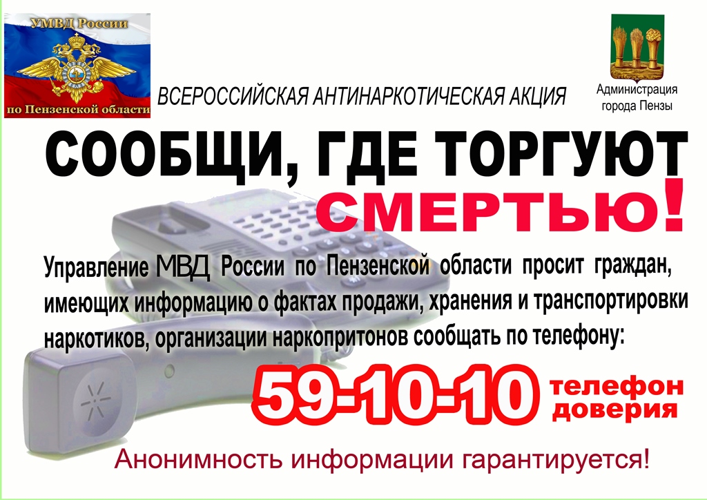 Каждый житель города может внести свой вклад в противодействие распространению наркотиков и сообщить информацию об этом по телефону «горячей линии» УМВД России по Пензенской области: 59-10-10 (круглосуточно).